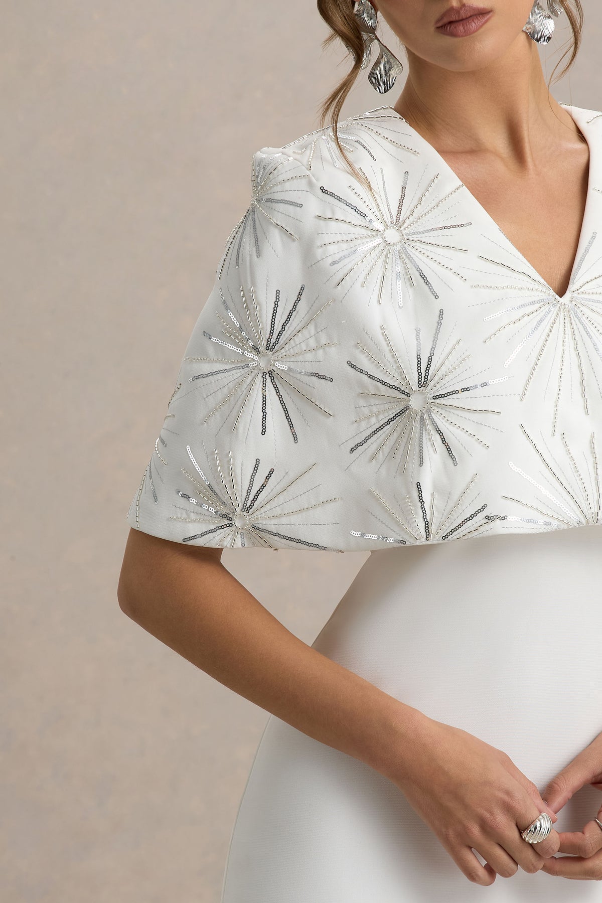 Be prepared to steal the spotlight and dazzle the night away in Agnella. This maxi is cut from our premium stretch crepe, to enhance your silhouette, in a timeless shade of white. Boasting a plunge neckline and featuring a statement embellished cape, that exudes elegance and allure, for the ultimate chic finish. This occasion piece is perfect for your next black tie event paired with sleek heels and a shimmering clutch bag, for a look that'll turn heads.