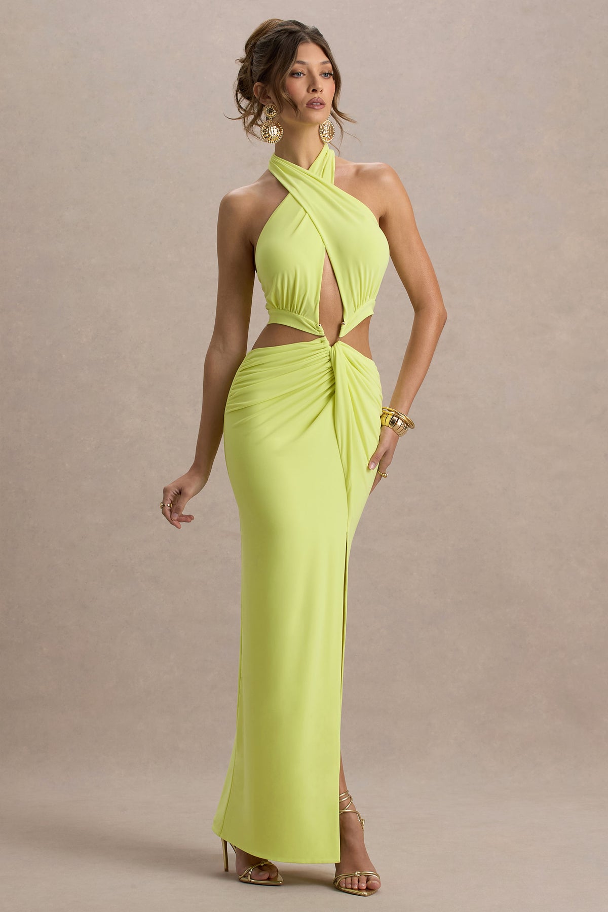 Step into the room and let your Aura do the talking. Designed to command attention, this show-stopping maxi is cut from our signature premium stretch jersey, in a rich lime green hue. This dress will sculpt your curves with effortless elegance. The halter neckline features a functional tie for a customizable fit, while the daring body cut-outs and a a luxe metal detail at the waist create a cinched hourglass silhouette. Style with sleek heels and let your presence speak for itself.