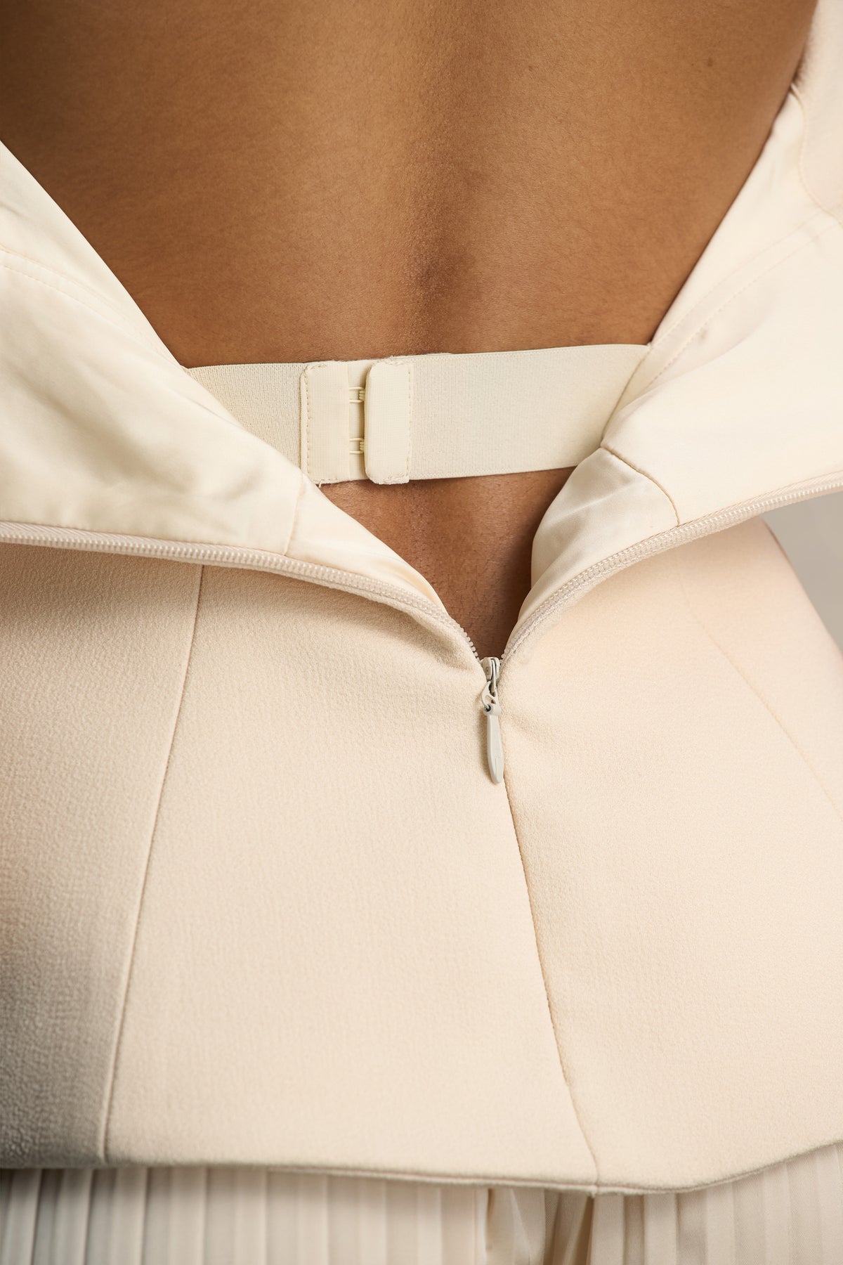 Own the room at your next dressed up occasion in Feeling Good , a sleek and sculpting piece made to command attention. Cut from our premium bonded scuba crepe in a rich nude hue, this statement jumpsuit exudes elegance. The classic bandeau neckline and a structured corseted bodice cinch you in flawlessly, ensuring you are flattered from all angles. The pleated trousers add tailored elegance and gorgeous movement with every step. From date nights to black tie events, In Feeling Good you won't be forgotten.