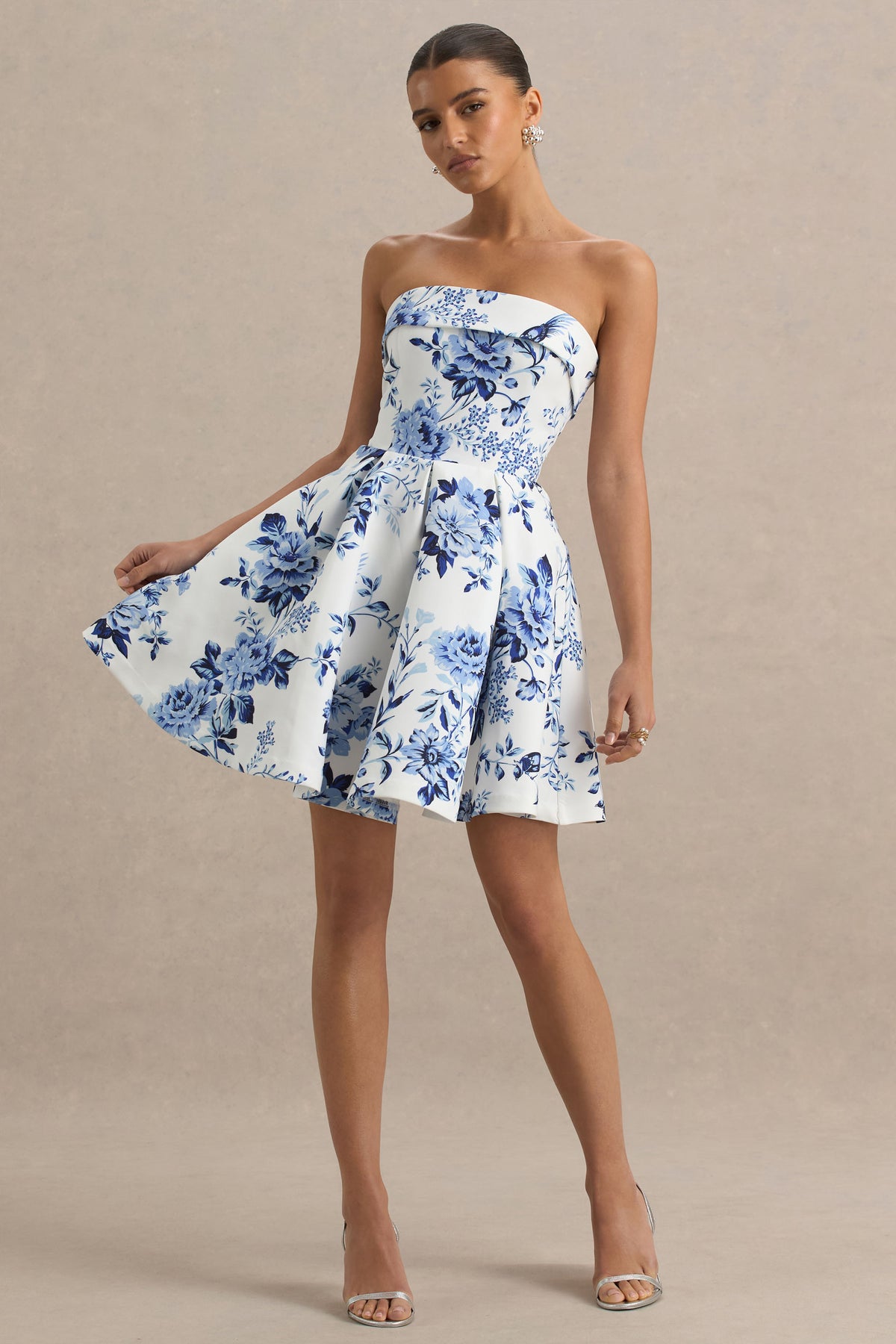 Delicate and feminine, Fiorenza is this summers must have mini. Designed in a blue porcelain print, of our premium stretch crepe, this dress will flatter you from all angles. The bandeau neckline and a pleated skirt give this piece a chic finish, that is perfect for all events this season. Style with a glamourous up do and a strappy heel to complete the look.