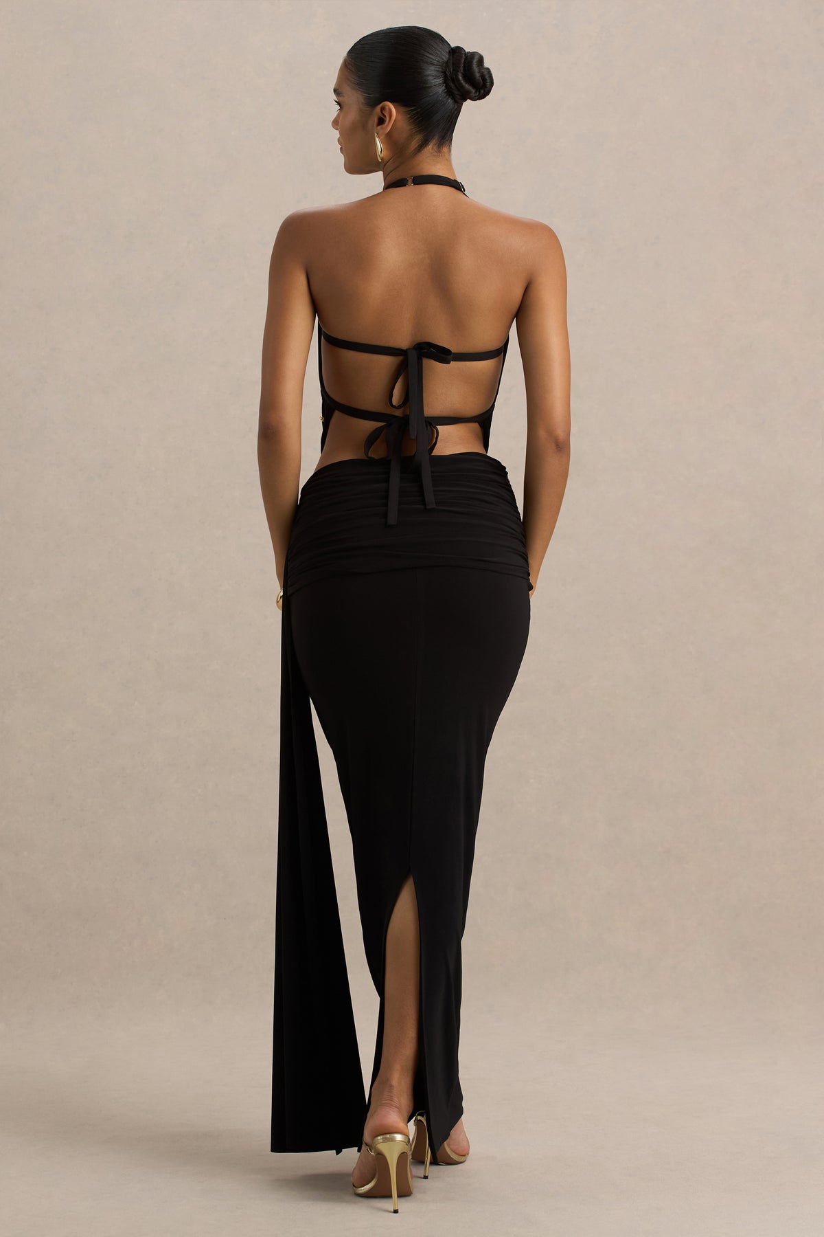 Sculpted to perfection, Joi is the definition of elevated elegance. Cut from our signature premium stretch jersey in a timeless black, this ultra-flattering piece is designed to hug your curves in all the right places. Featuring an asymmetric waist with ruched detailing to enhance your silhouette, and a fluid sash that adds movement and drama. Joi is the ultimate wardrobe power piece. The maxi length makes it perfect for pairing with heels and a sleek top for evening allure.