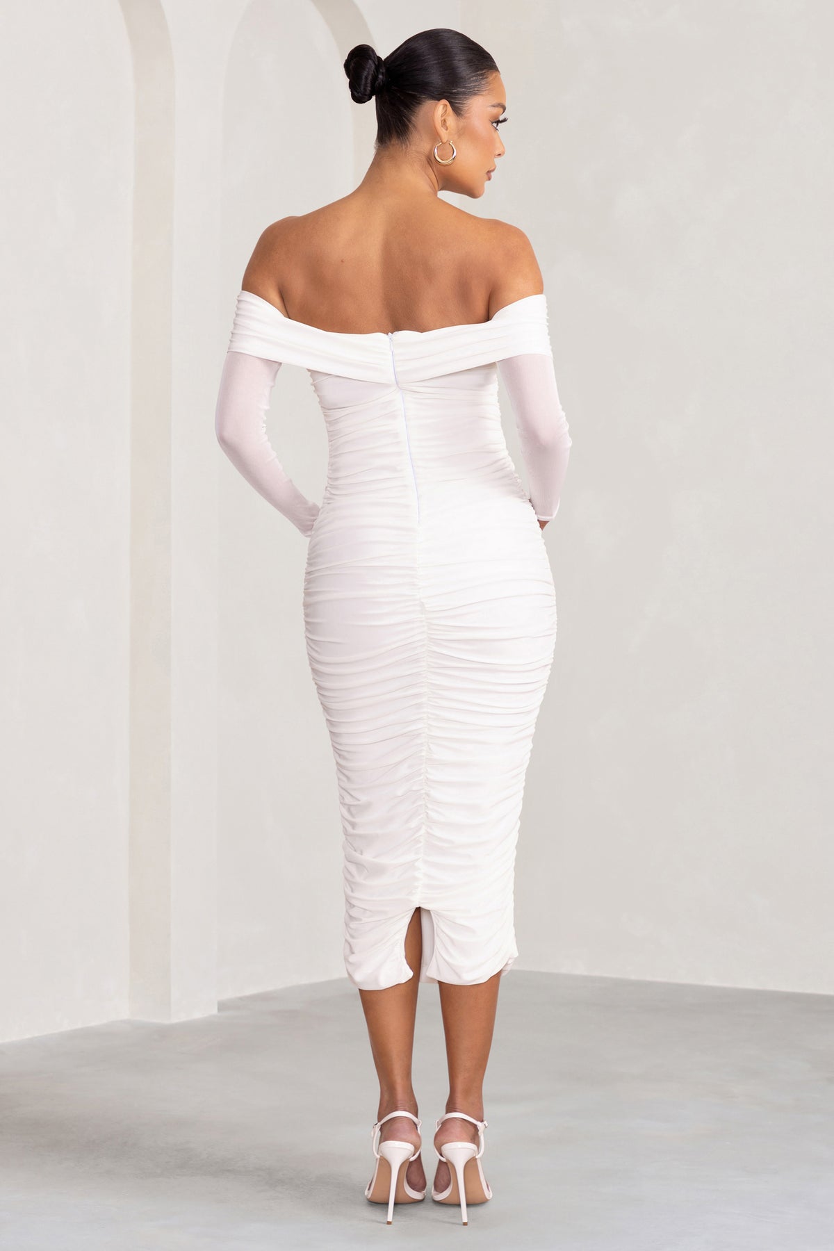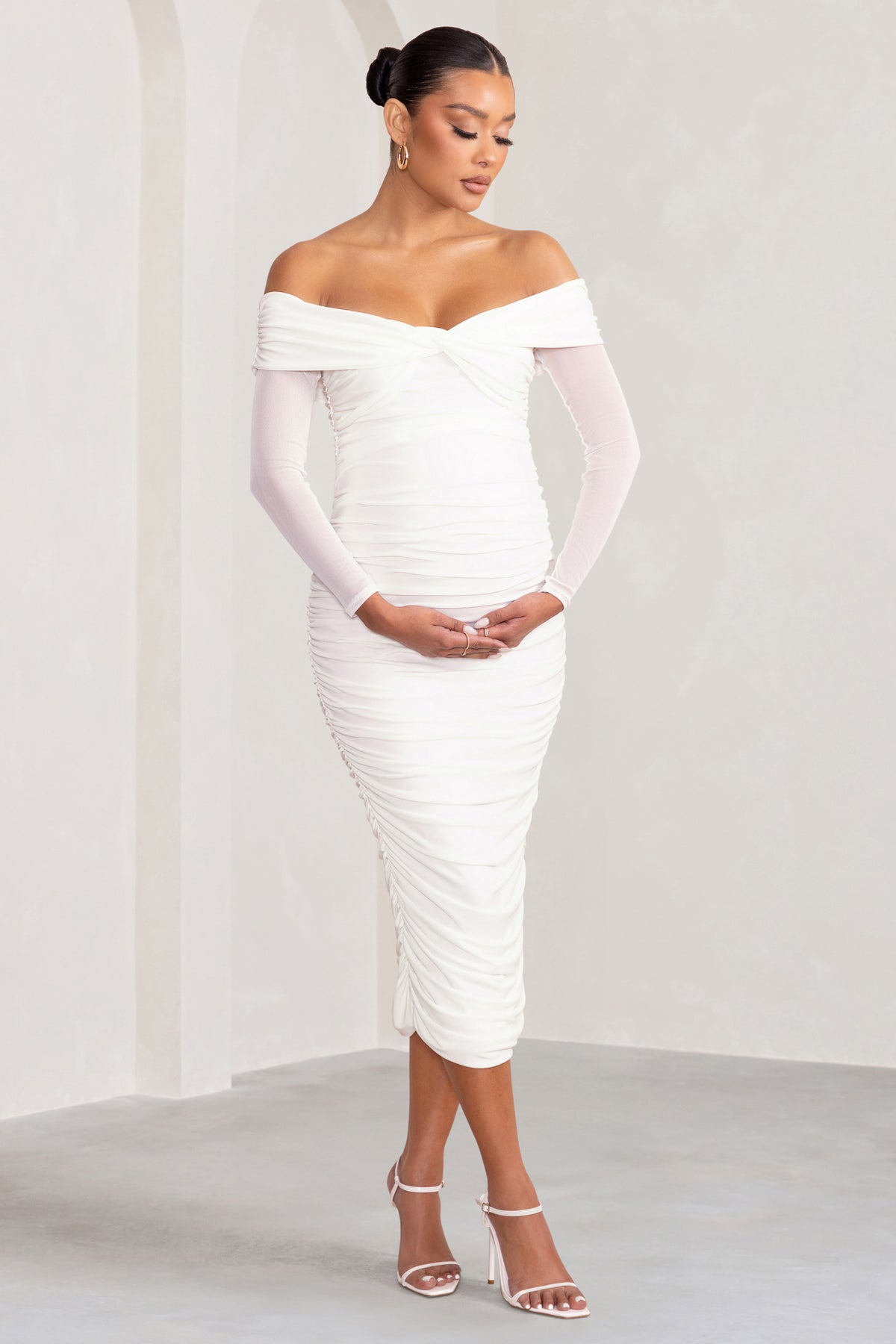 A fine layer of soft white mesh adds a delicate touch to our Neva maternity dress. Crafted from a luxurious double-lined jersey with plenty stretch for your growing bump, this midi dress boasts a twisted Bardot neckline, long sheer sleeves and ruching throughout. Pair our Neva with classic gold hoops for the prefect baby shower ensemble.