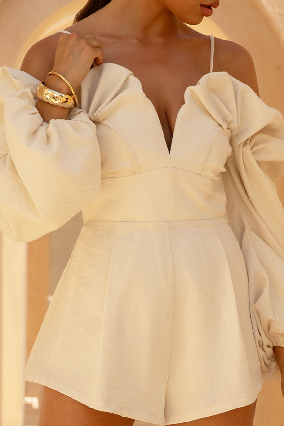 Effortless elegance meets summer chic in our Normani playsuit. Crafted in a soft cream shade of our premium linen, this piece is a must have for the season. Designed with a daring plunge neckline, that strikes a contrast with the blouson sleeves and ruffled detailing, making this playsuit a seamless blend of allure and femininity. Style with sandals and beachy waves for day time glam, or pair with heels and gold accessories for a girly evening look that'll captivate.