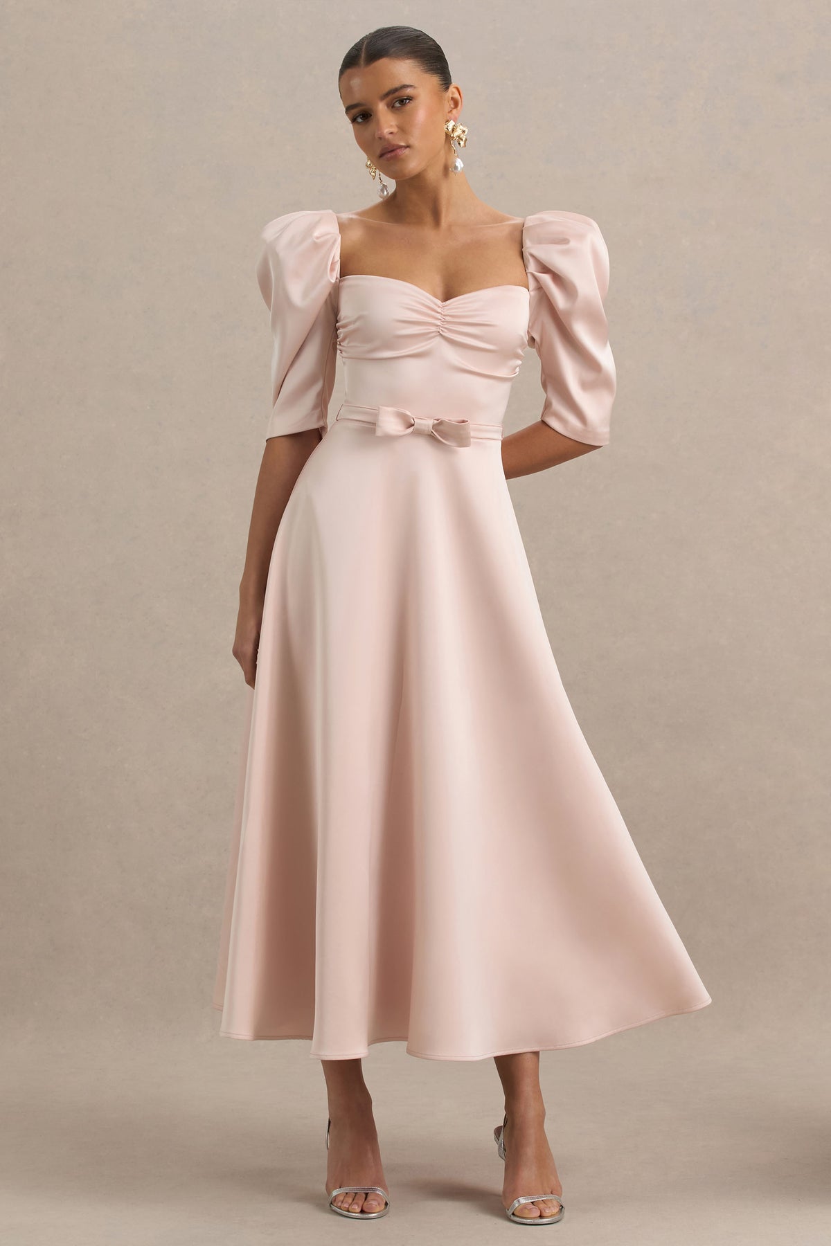 Become a vision of timeless elegance and allure in Rosey. This midi dress is cut from our premium stretch satin, in a stunning pale pink hue, offering a flawless fit for any occasion. The sweetheart neckline adds a touch of soft femininity, while the structured sleeves provide drama and sophistication. Cinching the waist with a delicate bow detail, Rosey creates a sculpted silhouette that's effortlessly chic. Whether you're attending a wedding or a glamourous dinner, this showstopping piece ensures you make an unforgettable entrance.