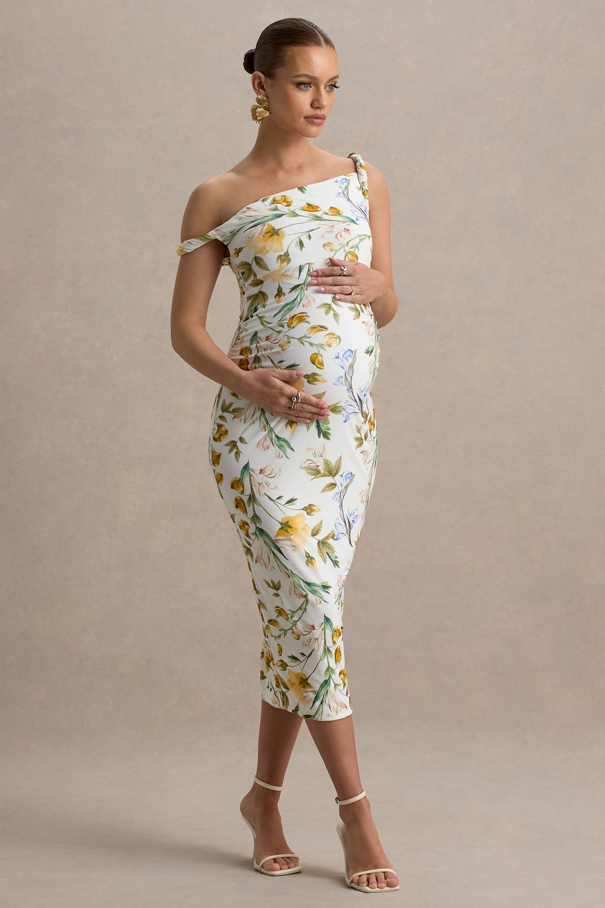 Minimalistic with a twist, say hello to Salome. This latest maternity midi dress in a white botanical floral print has been crafted in our premium brushed jersey for figure-flattering comfort. Detailed with an asymmetric twisted neckline for a new season shape, keep Salome at the forefront with a sleek updo and gold accents