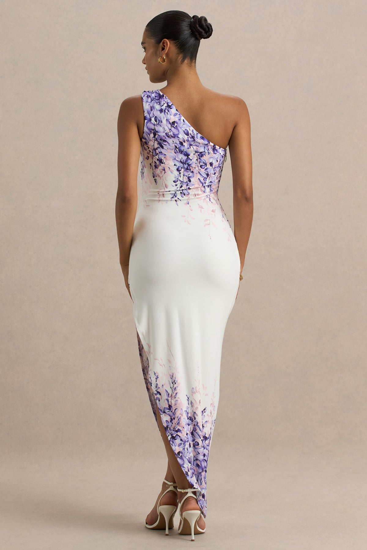 Feminine with a touch of edge, Sybil is the ultimate figure-flattering statement. Cut from our premium stretch jersey in a romantic purple floral print, this midi dress is perfect for making an entrance. Featuring an asymmetric neckline and hemline for a, sculpted silhouette. Completed with ruched detailing that enhances your curves in all the right places, creating a sleek and confident finish. Style Sybil for weddings, garden parties, or sunset cocktails, with delicate jewellery.
