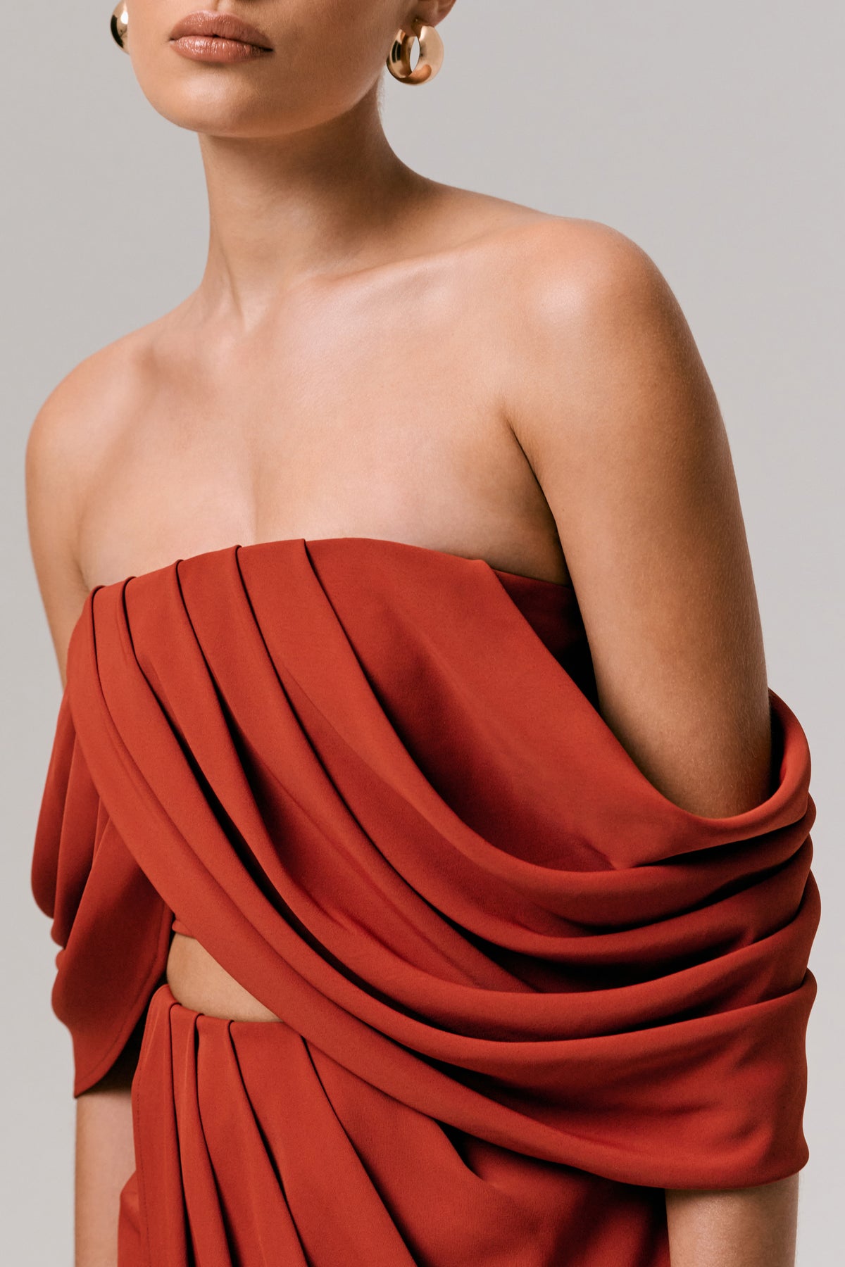 Exude effortless elegance this season in our Talika top. Designed in a rich terracotta shade of our premium lightweight woven, this crop top is designed to stun at any summer occasion. Talika is finished with a chic bardot neckline that features elegant draping. The corseted bodice ensures you're completely snatched and feel as good as you look. Style with our Zelina skirt and gold jewellery for the ultimate look.