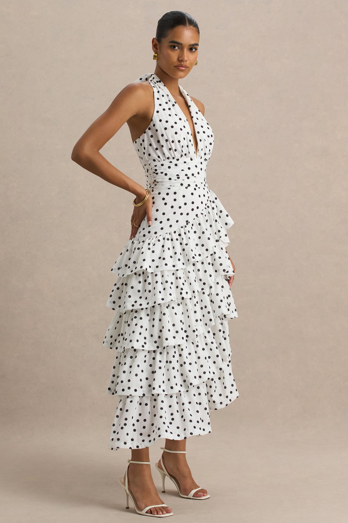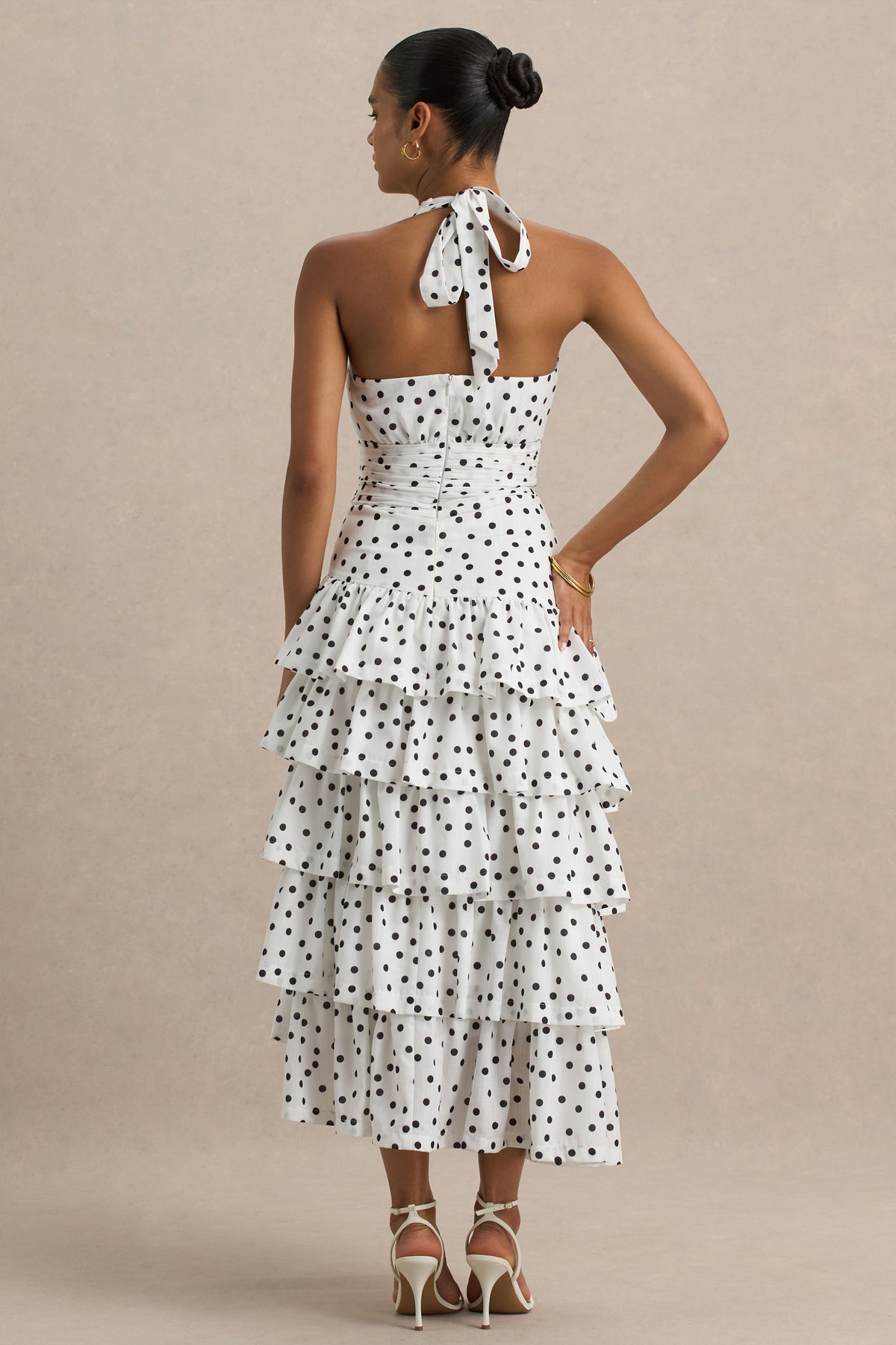 White Polka Dot Midi Dress With Halter-Neck and Ruffled Skirt