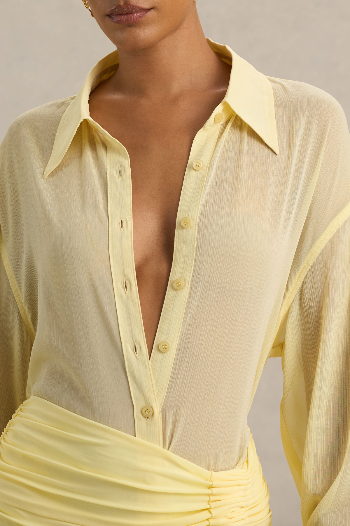 Say hello to the shirt of the season, Zinna, a must have in your suitcase this summer. Cut in a soft lemon hue of our premium crinkle chiffon, this shirt exudes effortless elegance. The plunge neckline, paired with the classic collar gives this piece gorgeous feminine structure that elevates any look. Designed with a sheer finish makes this shirts styling options endless, pair on top of swimwear for a chic beach club vibe or with a sleek mini skirt and heels for a stunning dinner outfit.